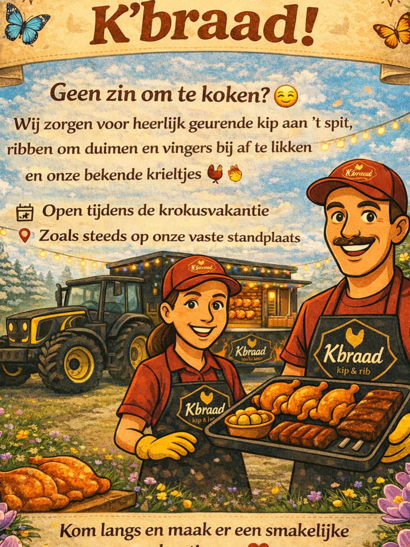 Het kweken van de kippen en het bewerken van de velden waren een passie. Maar niet alle seizoenen waren even druk. we konden niet stil staan en wouden zelf iets opbouwen, met de handigheid ,creativiteit en de nodig diploma's dat we al op zak hadden was het snel geklonken. Zo zijn wij op het idee gekomen om een kip aan't spitkraam te runnen.